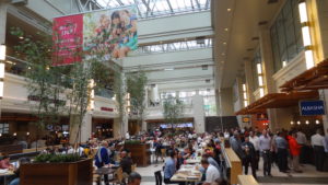 In der Main Street zieht’s uns ins „Convention Center“. Dies ist ein grosser Einkaufskomplex mit einer riesigen Auswahl an Kleidern, Schuhen, Brillen, Taschen usw., Ebi Square in Salt Lake. Wir betreten den „Food Court“ in dieser sehr grossen Anlage, was uns ein Schmunzeln entlockt. Alle bekannten Fast Food Ketten haben hier eine Verkaufstheke. Es geht zu wie in einem Bienenhaus. Dementsprechend ist auch der Lärmpegel. Sogar eine Hochzeitsgesellschaft verpflegt sich in einer Ecke,  bei uns unvorstellbar!  Hochzeitsessen im Mac Donald 😩.