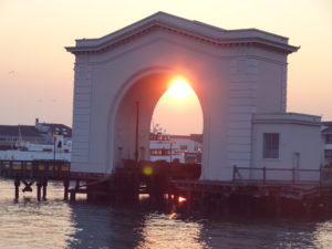 Der Körper hat die Zeitverschiebung noch nicht erkannt. Schon um 01:30h hellwach. Wir geben das Herumwälzen auf und machen uns auf den Weg an die Pier. Die Stadt „schläft“ noch. Wir werden mit einem sehr schönen Sonnenaufgang belohnt.