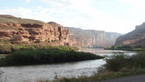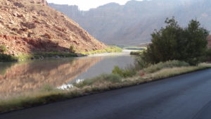 Gestärkt mit einem Frühstück machen wir uns auf den Weg. Nahe beim Hotel zweigen wir auf die 128 East. Eine wunderschöne Route, dem Colorado River entlang. Der River und die Strasse und auf beiden Seiten Felsen. Mal öffnet sich das Tal und schon wird es wieder enger.