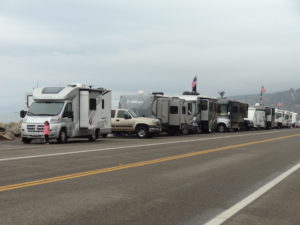 Wir bewegen uns weiter auf dem legendären HWY Nr. 1 südwärts (ab Sanata Barbara auch Pacifica Highway genannt). Auf der Meerseite stehen Dutzende von Riesen-Camper auf Parkplätzen. Auf der einen Seite abfallender Fels ins Meer und auf der anderen die Strasse. Hier verbringen die eingefleischten Amis für 30$ am Tag „Campingferien“.