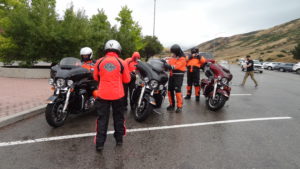 Wir Frauen haben aufgrund der Wettervorhersage gestern Abend beschlossenum 08:00h zu fahren. Der Wetterbericht verleitet uns nicht zu Luftsprüngen und dennoch hoffen wir, einige der 290km auf der I-80 West, trocken hinter uns zu bringen. Dunkle Wolken hängen am Himmel und die Temperatur ist bei 8 Grad. Die warmen Kleider und die Regenkleider mit den Masken lassen uns wie Micheline Männchen aussehen. Weit gefehlt mit unserem Wunsch. Schon nach 25km fallen die ersten Tropfen, dann Schneegraupel und schon bald Schneefall. Wir bewegen uns auf 2’100m und es ist empfindlich kalt mit nur noch 0.50° C.