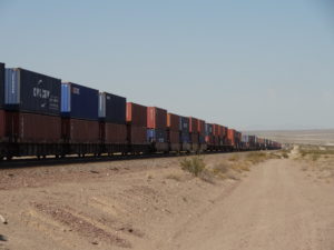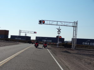 Die Barriere ist beim Bahnübergang geschlossen. Ob der Länge der Züge kommen wir nicht mehr aus dem Staunen. Am Anfang 2 Loks, dann ca. 150 Wagen und am Ende nochmals 2 Loks, eben alles ein bisschen grösser.